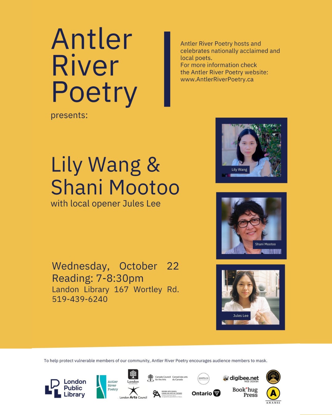 Antler River Poetry Presents Lily Wang and Shani Mootoo with local opener Jules Lee!