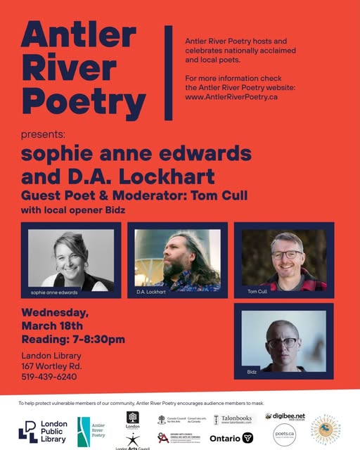Antler River Poetry Presents sophie anne edwards & D.A. Lockhart with local opener Bidz & guest poet & moderator Tom Cull
